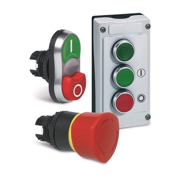 Esecuzioni multiple in custodie a 1,2,3 e 6 fori, Foro da 22 mm, Attuatori a pressione, a fungo ed a levetta, Esecuzioni sporgenti ed a filo pannello, Protezione IP 66, Clip di fissaggio per 1,2,3 e 5 contatti con terminali avite, faston e per circuiti stampati, Pulsanti di emergenza realizzati secondo la normativa di sicurezza in conformità alla Direttiva Macchine